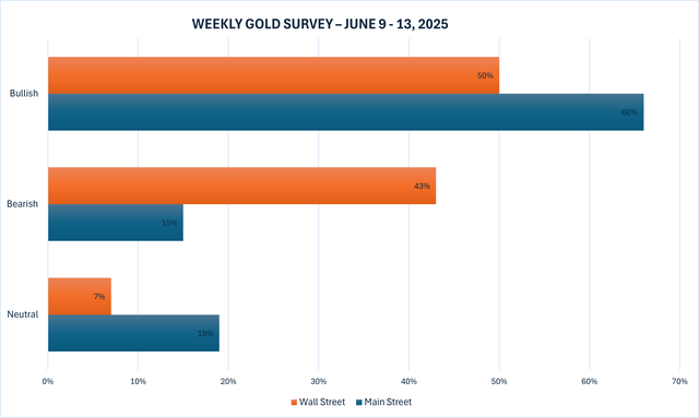 Tuần này, 14 nhà phân tích đã tham gia Khảo sát vàng của Kitco News, với Phố Wall vẫn giữ thái độ chờ đợi và quan sát sau đợt tăng giảm trong tuần này. Bảy chuyên gia, hay 50%, dự kiến giá vàng sẽ tăng trong tuần tới, trong khi sáu nhà phân tích khác, hay 43%, dự đoán giá vàng sẽ giảm. Nhà phân tích còn lại, chiếm 7% tổng số, dự kiến giá vàng sẽ đi ngang vào tuần tới.