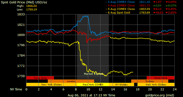 Giá vàng thế giới phiên ngày thứ Sáu bị bán tháo mạnh, do ảnh hưởng bởi chứng khoán, đồng USD và lợi suất trái phiếu Mỹ đều tăng cao, sau khi dữ liệu việc làm tháng 7 tích cực mới được công bố của Mỹ không chỉ hỗ trợ cho sự phục hồi kinh tế mạnh mẽ, mà một số nhà phân tích còn cho rằng, điều này sẽ thúc đẩy Fed đưa ra kế hoạch giảm lượng mua trái phiếu vào đầu năm 2022.