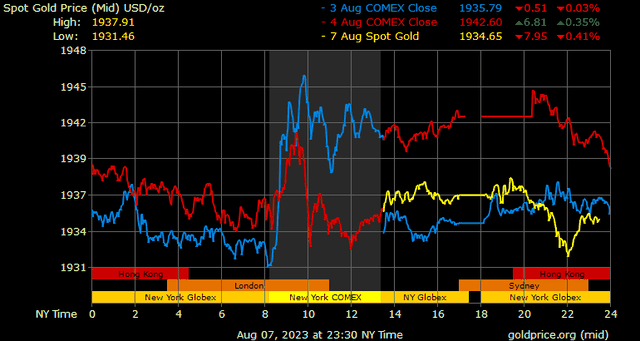 Trên thị trường vàng thế giới, giá vàng giao ngay chốt phiên hôm qua tại Mỹ giảm 6,2 USD lên 1.936,4 USD/ounce. Sang phiên châu Á sáng nay, giá vàng tiếp tục điều chỉnh nhẹ xuống mức 1.933,6 USD/ounce.