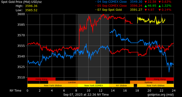 Trên thị trường vàng thế giới, giá vàng giao ngay chốt phiên cuối tuần trước tại Mỹ tăng 40,7 USD lên mức 3.586,5 USD/ounce. Sang phiên châu Á sáng nay, giá vàng tăng nhẹ 5 USD lên 3.591,5 USD/ounce.