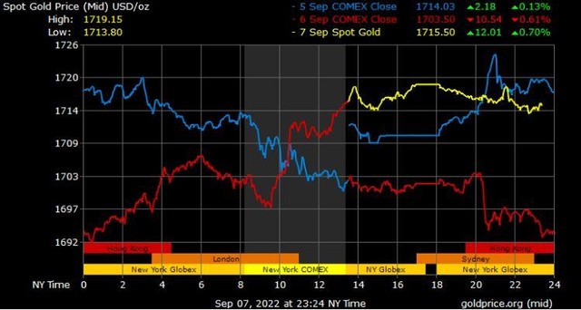 Giá vàng tương lai giao tháng 10/2022 trên sàn Comex New York tăng 14,8 USD lên 1.718,2 USD/ounce.