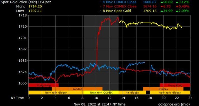 Giá vàng tương lai giao tháng 12/2022 trên sàn Comex New York tăng 35,5 USD lên mức 1.716 USD/ounce.