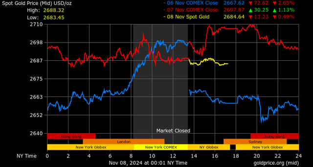 Mặc dù phe mua đã có thể ổn định sau đợt giảm mạnh vào giữa tuần bởi sức nóng của cuộc bầu cử Mỹ, nhưng sự phục hồi của chỉ số đô la Mỹ và giá dầu thô thấp hôm nay đang có lợi cho phe bán trên thị trường kim loại quý, do đó giá vàng chỉ giảm nhẹ.