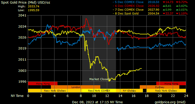 Giá vàng tương lai giao tháng 2/2024 trên sàn Comex New York giảm 31,9 USD, tương ứng giảm 1,56% xuống 2.014,5 USD/ounce.