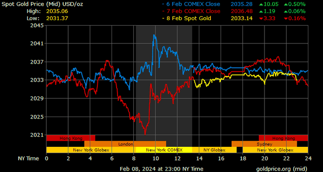 Giá vàng tương lai giao tháng 4/2024 trên sàn Comex New York giảm 3,8 USD, tương ứng giảm 0,19% xuống 2.047,9 USD/ounce.