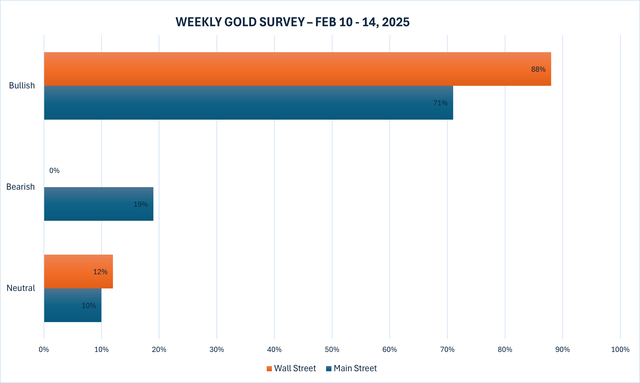 Tuần này, 17 nhà phân tích đã tham gia Khảo sát vàng của Kitco News, với phe bi quan hoàn toàn bỏ đi vì tất cả những người trả lời đều thấy giá vàng tăng hoặc giậm chân tại chỗ. 15 chuyên gia, hay 88%, kỳ vọng giá vàng sẽ lập mức cao kỷ lục mới trong tuần tới, trong khi hai nhà phân tích, hay 12%, thấy giá vàng sẽ ổn định hoặc hợp nhất vào tuần tới. Không ai dự đoán giá kim loại quý này sẽ giảm.