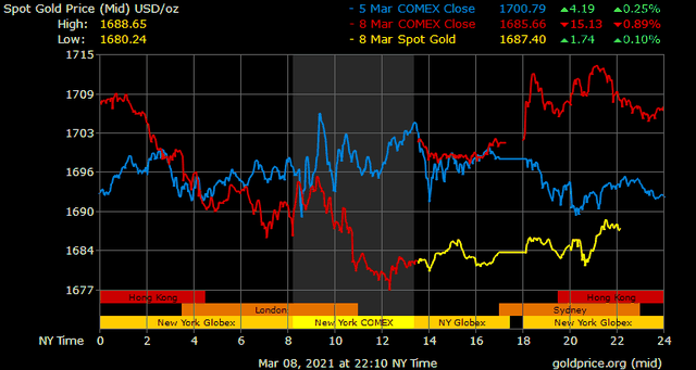Trên thị trường vàng thế giới, giá vàng giao ngay chốt phiên đêm qua tại Mỹ giảm 17,2 USD xuống 1.682,9 USD/ounce. Sang phiên châu Á sáng nay, giá vàng hồi nhẹ lên trên 1.687 USD/ounce.