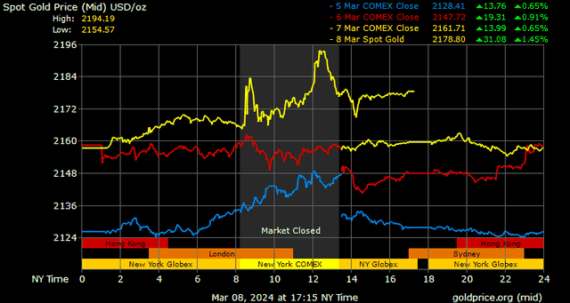 Giá vàng tương lai giao tháng 4/2024 trên sàn Comex New York tăng 20,3 USD, tương ứng tăng 0,94% lên 2.185,5 USD/ounce.