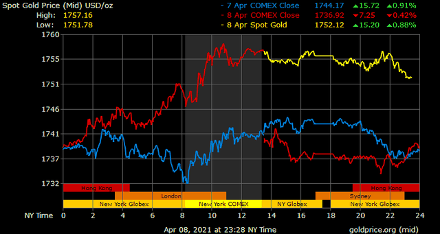 Trên thị trường vàng thế giới, giá vàng giao ngay chốt phiên đêm qua tại Mỹ tăng 18,2 USD lên 1.755,8 USD/ounce. Sang phiên châu Á sáng nay, giá vàng giảm nhanh về gần ngưỡng 1.750 USD/ounce.