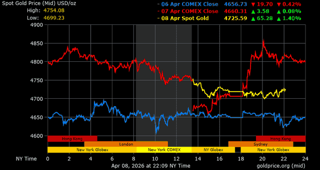 Trên thị trường vàng thế giới, giá vàng giao ngay chốt phiên hôm qua tại Mỹ tăng 14,2 USD, tương ứng tăng 0,3% lên mức 4.719 USD/ounce. Sang phiên châu Á sáng nay, giá vàng tiếp tục tăng nhẹ 5,4 USD lên mức 4.724,3 USD/ounce.