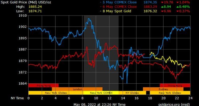 Vàng đã không thể giữ trên mức 1.900 USD/ounce trong tuần vừa qua do thị trường có phản ứng rất thất thường trước việc Fed nâng lãi suất nửa điểm vào thứ Tư trong khi loại trừ mức tăng 75 bps tại cuộc họp tháng Sáu. Kim loại quý đã kết thúc tuần giảm 1,6%, với giá vàng kỳ hạn tháng 6 trên sàn Comex giao dịch cuối cùng ở mức 1.883,30 USD/ounce.