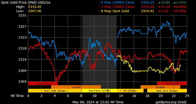 Giá vàng tương lai giao tháng 6/2024 trên sàn Comex New York giảm nhẹ 1,9 USD, tương ứng giảm 0,08% xuống mức 2.322,3 USD/ounce.