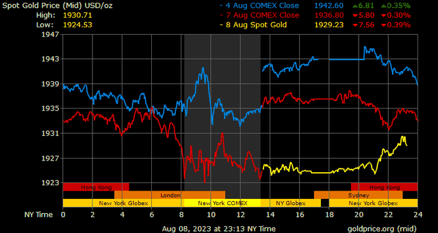 Giá vàng tương lai giao tháng 12/2023 trên sàn Comex New York giảm 10,1 USD, tương ứng giảm 0,51% xuống 1.959,9 USD/ounce.