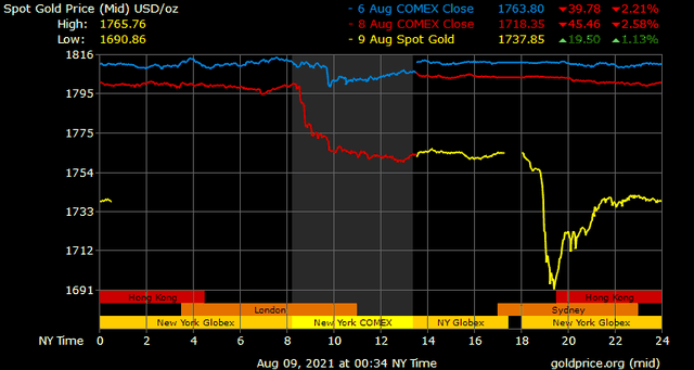 Giá vàng thế giới phiên ngày thứ Sáu bị bán tháo mạnh và tiếp tục giảm sâu trong sáng ngày đầu tuần hôm nay, do ảnh hưởng bởi chứng khoán, đồng USD và lợi suất trái phiếu Mỹ đều tăng cao, sau khi dữ liệu việc làm tháng 7 tích cực của Mỹ đã chỉ ra khả năng Fed sẽ giảm lượng mua trái phiếu vào đầu năm 2022.