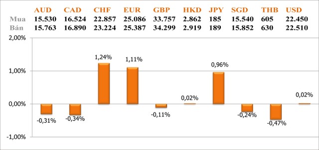 Với các ngoại tệ khác, trong 2 ngày đầu tuần, số tăng và giảm so với VND khá cân bằng. Ở chiều tăng, đồng CHF và EUR tăng mạnh nhất với 1,24% và 1,11%. Ở chiều ngược lại, đồng THB giảm mạnh nhất, nhưng cũng chỉ giảm 0,47%.