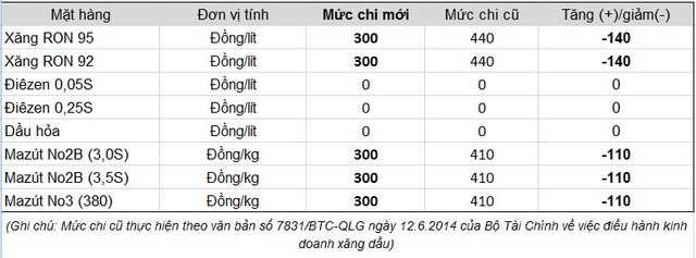Cũng trong ngày 23/6, Bộ Tài chính cũng có văn bản giảm mức chi sử dụng Quỹ Bình ổn giá (BOG), cũng áp dụng từ 20h ngày 23/6/2014. Cụ thể: