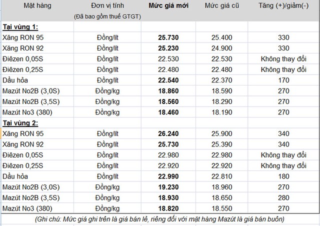 Sau khi tăng giá, các mặt hàng xăng dầu sẽ có giá bán lẻ tối đa là xăng RON 92 giá bán 25.230 đồng/lít, dầu diesel giá bán là 22.556 đồng/lít, dầu hỏa là 22.547 đồng/lít, dầu mazut là 18.560 đồng/lít.