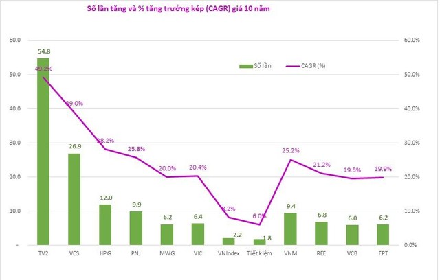 TV2 tăng 54,8 lần, CAGR 49,2%/năm. Nếu bạn đầu tư 100 triệu đồng vào TV2 10 năm trước, bây giờ bạn có 5,48 tỷ đồng, các cổ phiếu khác xem trên biểu đồ. Nếu bạn gửi tiết kiệm với lãi suất 6%/năm, thì bây giờ bạn chỉ có 180 triệu đồng.