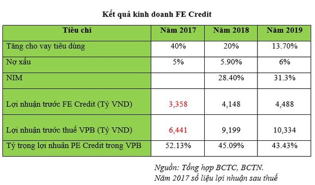 Mảng vay tiêu dùng luôn đóng góp lớn vào kết quả kinh doanh của VPB, chiếm tỷ trọng 52,13% lợi nhuận sau thuế năm 2017, năm 2018 là 45,09% và năm 2019 là 43,43%.