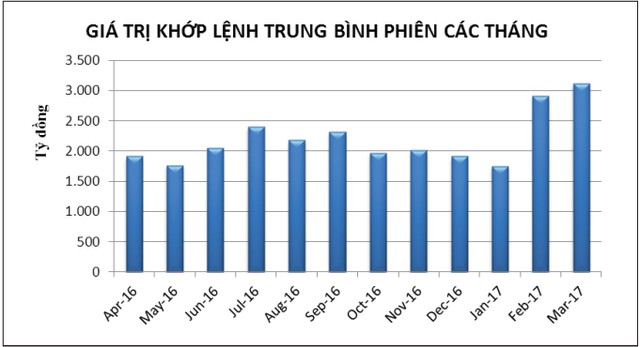Thống kê của Báo Đầu tư Chứng khoán cho thấy, tính từ đầu tháng 2 tới hết phiên giao dịch ngày 10/3/2017, tổng giá trị giao dịch khớp lệnh (không tính giao dịch thỏa thuận) của sàn HOSE đạt gần 80.808 tỷ đồng, giá trị giao dịch trung bình phiên đạt gần 2.993 tỷ đồng. Riêng trong tháng 2, giá trị giao dịch khớp lệnh trung bình phiên đạt 2.917 tỷ đồng và 8 phiên đầu tháng 3 đạt 3.174 tỷ đồng.