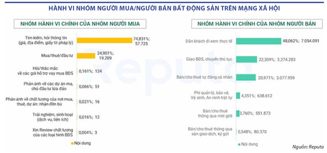 Báo cáo mới đây của Reputa - hệ thống lắng nghe và hỗ trợ giám sát danh tiếng do Viettel phát triển cho thấy, các nội dung “tìm kiếm, hỏi thông tin (bao gồm giá sản phẩm, địa điểm dự án, thủ tục pháp lý)” và dịch vụ “mua/thuê/đầu tư bất động sản” được quan tâm nhiều nhất của nhóm người mua, chiếm lần lượt 74% và 25% tổng nội dung thảo luận. Tại nhóm người bán, các nội dung liên quan đến dẫn khách đi thực tế đang được trao đổi nhiều nhất, chiếm 48,06% tổng nội dung thảo luận.