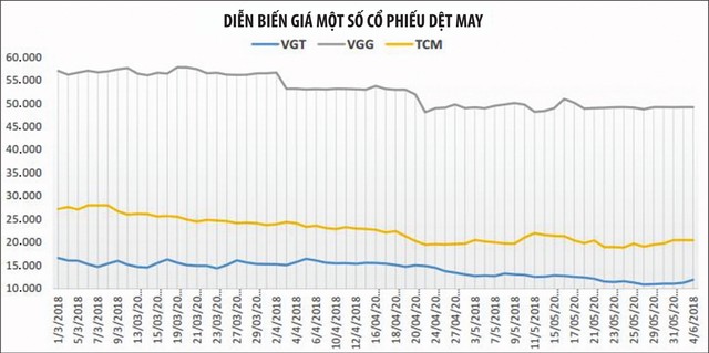 Trên 2 sàn niêm yết, nghịch lý này cũng diễn ra với những tên tuổi lớn và lâu năm như TCM, STK, EVE, KMR, TNG, GMC. Trong khi VN-Index có giai đoạn tăng mạnh mẽ (từ đầu tháng 2 đến đầu tháng 4/2018) thì cổ phiếu dệt may lại hờ hững, thậm chí “quyết tâm” đi ngược thị trường.