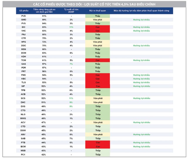 Về danh mục cổ phiếu nên theo dõi, tại HSC, chúng tôi phân tích và đưa ra khuyến nghị cho các cổ phiếu chiếm hơn 80% tổng vốn hóa thị trường chứng khoán (xem bảng). Do diễn biến thị trường vẫn còn tiềm ẩn nhiều yếu tố bất ổn, đội ngũ phân tích chưa điều chỉnh giá mục tiêu cho đến khi có thêm thông tin cụ thể. Trong trường hợp chính sách thuế quan duy trì ở mức hiện tại hoặc có điều chỉnh theo hướng tích cực, khả năng điều chỉnh giá mục tiêu sẽ thấp, hoặc mức điều chỉnh sẽ không đáng kể. Trong kịch bản đó, các cổ phiếu đầu bảng về tiềm năng tăng giá sẽ là lựa chọn ưu tiên. Nhà đầu tư cũng nên cân nhắc các mã có tỷ suất cổ tức hấp dẫn để gia tăng hiệu quả đầu tư trong giai đoạn này.