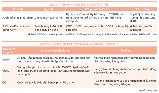 Thứ hai, bổ sung trục chất lượng nhờ dashboard (bảng điều khiển) theo dõi biểu đồ nhiệt cho dòng chảy tín dụng giải ngân trong kỳ - Credit Flow Watch (CFW). NHNN đã nhận thông tin về tình hình giải ngân mới của các ngân hàng phân loại theo nhóm ngành mỗi quý theo Thông tư 35/2015/TT-NHNN, nhưng trước nay hai chỉ tiêu này chỉ dùng cho thống kê thuần túy. Trong mô hình mới, chúng trở thành đầu vào để tính CFW: Nếu vốn đổ vào một ngành tăng nhanh hơn GDP danh nghĩa quá 8 điểm phần trăm, ngành ấy chuyển sang màu đỏ; ngược lại, ngành tăng chậm được gắn màu xanh. Ngành đỏ tự động kích hoạt bộ kiểm soát gồm hệ số vốn đệm (sectoral CCyB) 1 - 2,5%, trọng số rủi ro cộng thêm 25% và trần tăng trưởng 6%/năm. Ngành xanh được giảm trọng số rủi ro 10%, giảm dự trữ bắt buộc 50 điểm cơ bản hoặc hưởng lãi suất tái cấp vốn ưu đãi.