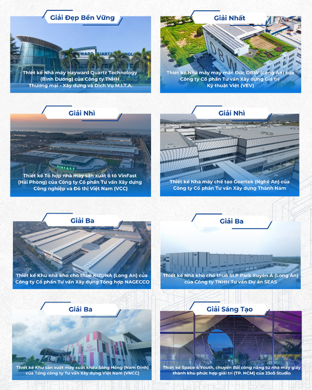Tại sự kiện chung kết Giải thưởng Kiến trúc Công nghiệp Việt Nam 2024 đã tôn vinh 8 công trình xuất sắc nhất, đáp ứng các tiêu chí về kiến trúc độc đáo – sáng tạo – tính bền vững.