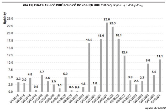 Năm 2023, huy động vốn thông qua chào bán cổ phiếu ra công chúng đạt 50.527 tỷ đồng, giảm mạnh so với con số 116.684 tỷ đồng năm 2022 và 102.500 tỷ đồng năm 2021.