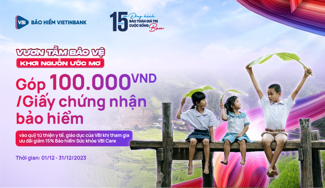 Nhân dịp sinh nhật 15 tuổi, từ ngày 1/12/2023 - 31/12/2023, VBI triển khai chương trình khuyến mãi ''Vươn tầm bảo vệ - Khơi nguồn ước mơ", ưu đãi vàng lên tới 15% sản phẩm Bảo hiểm Sức khỏe VBICare. Cụ thể, giảm ngay 10% cho 1 khách hàng tham gia; giảm ngay 15% từ 2 khách trở lên cùng tham gia trên 1 đơn bảo hiểm với khách hàng là người được bảo hiểm có độ tuổi từ 7-50 tuổi; khách hàng không tham gia bảo hiểm VBICare trong 2 năm kể từ ngày 01/01/2021.