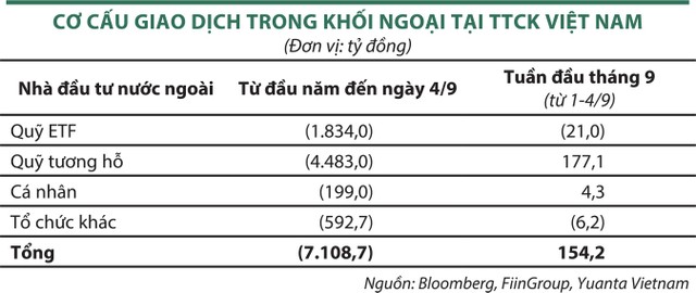 Tuy nhiên, xét tổng giao dịch của toàn bộ khối ngoại thì hoạt động bán ròng vẫn là chủ đạo. Cụ thể, giá trị bán ròng là 23,5 triệu USD trong tháng 7 và 147 triệu USD trong tháng 8.