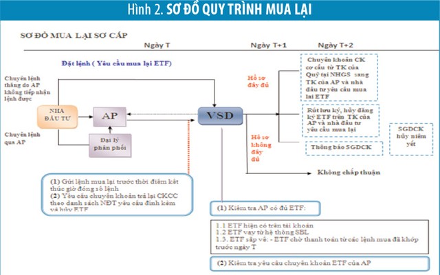 lThanh toán cho NĐT, AP vào ngày T+2 (ngày T là ngày giao dịch hoán đổi). Đối với các lệnh mua, VSD chuyển khoản số CKCC từ tài khoản AP, NĐT sang tài khoản của Quỹ ETF tại ngân hàng giám sát; đồng thời đăng ký bổ sung, lưu ký và ghi tăng số CCQ ETF phát hành thêm vào tài khoản của AP, NĐT. Đối với lệnh bán, VSD chuyển khoản số lượng CKCC từ tài khoản Quỹ ETF tại ngân hàng giám sát sang tài khoản của AP, NĐT; đồng thời rút lưu ký, hủy đăng ký và ghi giảm số CCQ ETF trên tài khoản AP, NĐT.