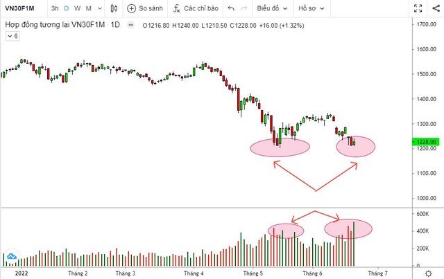 Hiện có 1 tín hiệu kỹ thuật đáng tin cậy từ diễn biến của thị trường chứng khoán phái sinh theo giá và khối lượng giao dịch: Trong diễn biến thị trường giảm điểm, kết hợp với đó là sự chán nản của nhà đầu tư, thời điểm Khối lượng giao dịch tại thị trường phái sinh tăng đột biến và cao hơn lịch sử thì thị trường cho tín hiệu tạo đáy ngắn hạn.