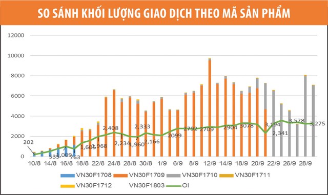 Thanh khoản thị trường tập trung vào các hợp đồng ngắn hạn, phù hợp với thông lệ quốc tế. Khối lượng mở (OI) toàn thị trường nhìn chung duy trì xu hướng tăng. Tính đến cuối ngày 29/9/2017, khối lượng OI của toàn thị trường tăng 51,2% so với cuối tháng 8, đạt 3.275 hợp đồng với OI của các hợp đồng VN30F1710, VN30F1711, VN30F1712 và VN30F1803 lần lượt là 2.843 hợp đồng, 62 hợp đồng, 153 hợp đồng và 217 hợp đồng.