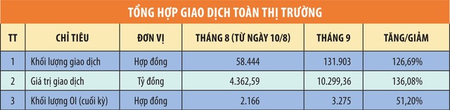 Tổng khối lượng hợp đồng giao dịch trong tháng 9 là 131.903 hợp đồng, tương ứng giá trị giao dịch (theo quy mô danh nghĩa hợp đồng) đạt 10.300 tỷ đồng, tăng 126,7% về khối lượng và 136% về giá trị giao dịch so với tháng 8. Tính bình quân, khối lượng giao dịch đạt 6.595 hợp đồng/phiên, giá trị giao dịch bình quân theo quy mô danh nghĩa đạt 514,96 tỷ đồng/phiên, gấp 1,9 lần so với tháng 8.