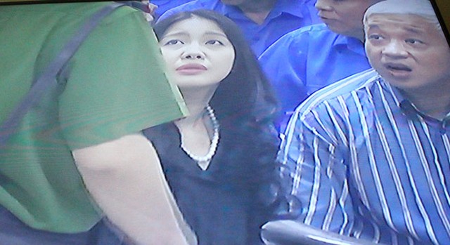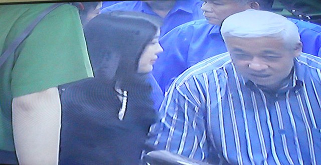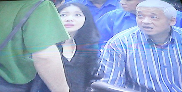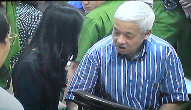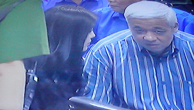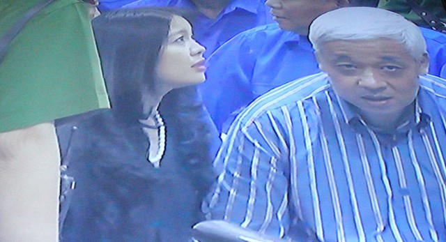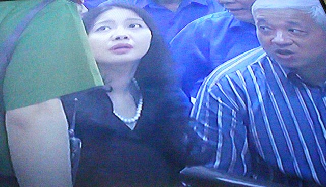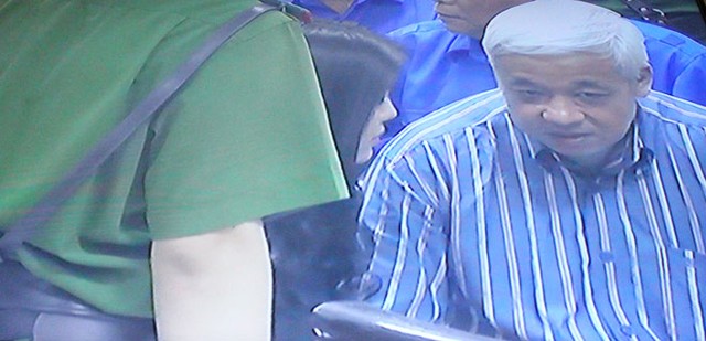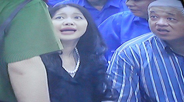 (ĐTCK) Trong phiên xét xử bầu Kiên sáng nay (23/5), một diễn biến bất ngờ đã xảy ra khi bà Đặng Thị Ngọc Lan, vợ ông Kiên đã xuống vị trí của bị cáo trước vành móng ngựa để gặp và nói chuyện bầu Kiên. (Ảnh chụp qua màn hình: Bùi Trang).