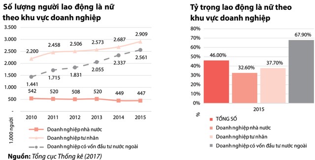 Trong năm 2015, phụ nữ chiếm 46% số việc làm trong toàn bộ khu vực doanh nghiệp chính thức. Tỷ trọng lao động nữ trong các doanh nghiệp tư nhân trong nước và doanh nghiệp vốn đầu tư nước ngoài (FDI) lần lượt là 37,7% và 67,9%, so với mức 32,6% tại các doanh nghiệp nhà nước. Tỷ lệ tham gia lực lượng lao động của phụ nữ là 79% (GSO, 2017).