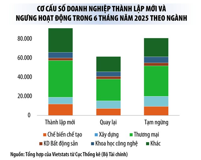 Tuy nhiên, bên cạnh làn sóng doanh nghiệp thành lập mới gia tăng, số doanh nghiệp tạm ngừng kinh doanh trong 6 tháng đầu năm 2025 còn cao, lên tới hơn 80.800 doanh nghiệp, tăng 13,3% so với cùng kỳ, cho thấy nhiều khó khăn vẫn hiện hữu trong nền kinh tế. Tình trạng doanh nghiệp tạm ngừng gia tăng ở hầu hết các ngành, đặc biệt là công nghiệp chế biến - chế tạo (+14,4%), bán buôn - bán lẻ (+13,5%) và một số lĩnh vực dịch vụ như truyền thông (+22,1%), y tế (+32%), giáo dục (+21,4%). Diễn biến này phản ánh áp lực lớn từ chi phí đầu vào, cạnh tranh gay gắt, thiếu vốn và môi trường kinh doanh còn thiếu ổn định, nhất là với doanh nghiệp nhỏ và vừa.