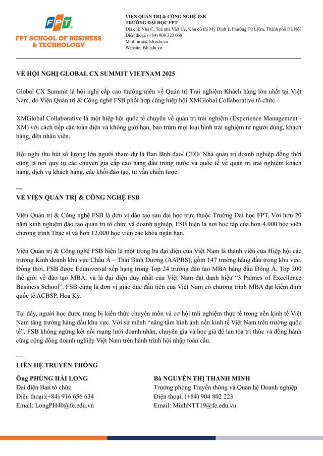 Viện Quản trị & Công nghệ FSB, trường Đại học FPT chính thức công bố tổ chức Hội nghị Global CX Summit 2025 - hội nghị Trải nghiệm Khách hàng thường niên quốc tế, diễn ra vào 13/12/2025 tại Tòa nhà FPT Hà Nội.