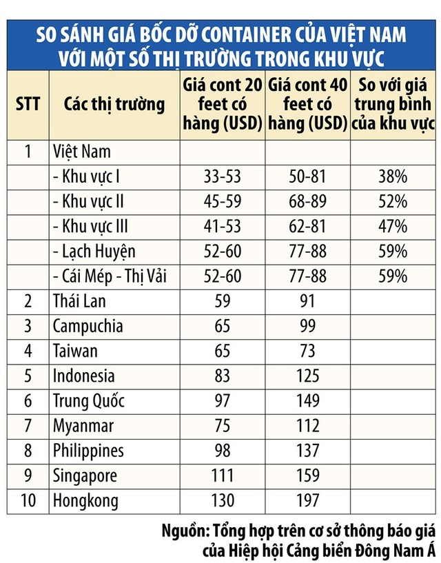Với những lý do trên, giá dịch vụ bốc dỡ container xuất nhập khẩu tại Việt Nam đang thấp nhất trong khu vực, bằng 38-59% so với mức giá bình quân của các nước trong khu vực. Thậm chí, so với mức giá cách đây 20 năm (do Ban Vật giá Chính phủ và Bộ Tài chính quy định) là 57 USD/cont 20 feet và 76 USD/cont 40 feet, mức giá hiện tại chỉ bằng 60-90% mức giá cách đây 20 năm, trong khi tổng mức đầu tư cho cảng biển lúc đó chỉ bằng 1/5 tổng mức đầu tư của cảng Cái Mép - Thị Vải hiện nay.