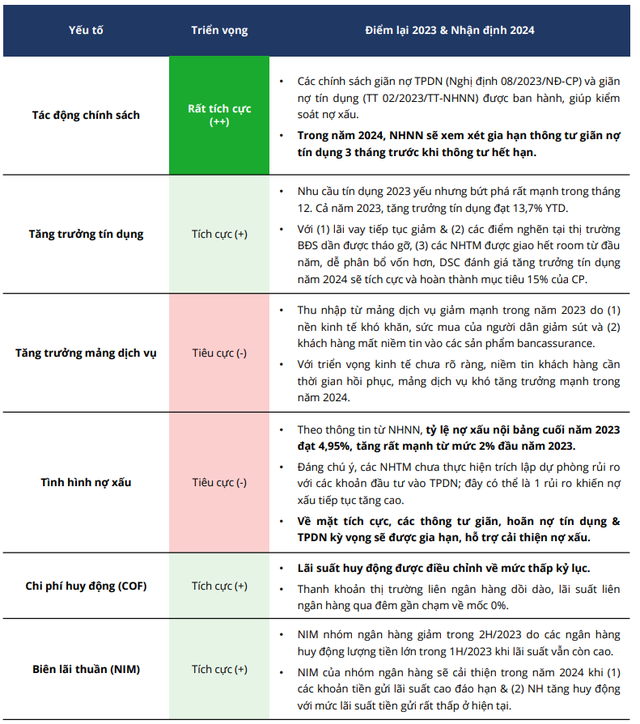 Đối với nhóm Ngân hàng, chúng tôi bảo lưu quan điểm 2024 là năm mà các yếu tố hỗ trợ vẫn đang trợ giúp tốt cho các yếu tố tiêu cực. Và các rung lắc nếu xảy ra sẽ chỉ trong ngắn hạn, nhờ mặt bằng còn rẻ tại nhiều cổ phiếu trong ngành.