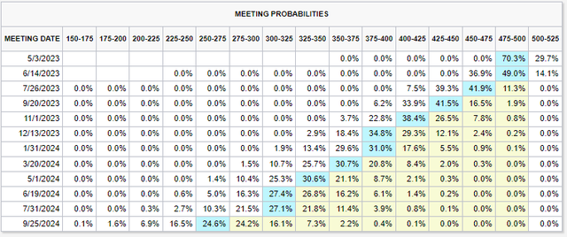 Kèm theo thông tin tăng lãi suất, FED đã tiếp tục nhấn mạnh thông điệp rằng lãi suất sẽ tiếp tục neo ở mức cao. Cụ thể, trong cuộc họp báo sau FOMC, ông Powell (chủ tịch FED) có phát biểu rằng NHTW Mỹ “sẽ tiếp tục điều chỉnh chính sách nếu cần thiết” để đạt được mục tiêu giảm lạm phát về mốc 2%. Ông cũng cho hay, FED không có kế hoạch giảm lãi suất điều hành trong năm 2023. Tuy nhiên, thị trường có vẻ đã không còn tin lời của người thuyền trưởng NHTW Mỹ. Theo đánh giá từ thị trường (sử dụng dữ liệu giao dịch tín phiếu), FED nhiều khả năng sẽ bắt đầu giảm lãi suất từ tháng 7/2023 và kết năm ở mức lãi suất 3,75% - 4%.