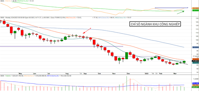Trên biểu đồ kỹ thuật, chỉ số ngành khu công nghiệp xuất hiện nhịp điều chỉnh, tương đối đồng thuận với độ trũng của số liệu vĩ mô. Trong một số tuần gần nhất, chỉ số đã xuất hiện tín hiệu vượt áp lực cản bán kéo dài 2 tháng vừa qua. Trong trường hợp, chỉ số ngành vượt trung bình động MA10 (vùng 71 điểm), tương đương chỉ báo RSI vượt cản kháng cự 40 thì mở ra xu hướng tăng mới trong trung hạn. Cổ phiếu đáng quan tâm: IDC, SZC, GVR.