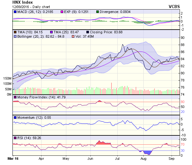 Với HNX-Index, phiên 12/9 là một cây nến đỏ. ADX hiện tại là 22.35 thể hiện xu hướng khá yếu. Các chỉ báo khác như MACD, Stochastic đều không cho tín hiện rõ ràng trong thời điểm này. Do đó, chỉ số sẽ tích lũy đi ngang trong vài phiên tới. Ngưỡng hỗ trợ là 83 điểm và ngưỡng kháng cự là 85 điểm.