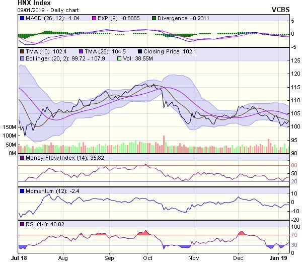 HNX-Index có diễn biến tương tự. Mặc dù, chỉ số có phiên tăng điểm trở lại nhưng vẫn duy trì dưới MA20, cho thấy xu hướng chính vẫn là giảm điểm, phiên tăng điểm có thể nằm trong nhịp phục hồi kỹ thuật, ngưỡng mục tiêu có thể là vùng kháng cự 103,6 điểm (Fib 78,6).