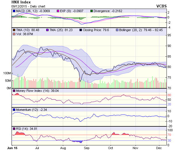 HNX-Index cũng chịu áp lực điều chỉnh khá mạnh trở lại tạo thành 1 Bearish Engulfing, test lại cận dưới của channel giảm điểm ngắn hạn của chỉ số này. Tuy nhiên, trạng thái biến động trong biên độ hẹp tại vùng giá hiện tại vẫn đang tiếp tục duy trì. Nếu tiếp tục chịu áp lực điều chỉnh và rơi xuống dưới ngưỡng hỗ trợ 79 điểm, HNX-Index sẽ sớm về vùng 77 điểm trong ngắn hạn.