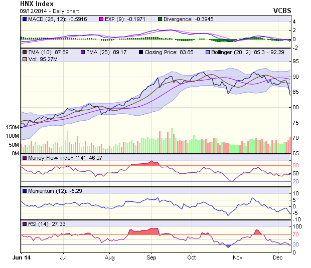 Trên sàn HNX, đồ thị của HNX-Index không xấu như VN-index tuy nhiên trong phiên hôm nay ngưỡng hỗ trợ động tại MA(100) bị phá vỡ một cách dễ dàng, trong những phiên tới HNX-Index cần trụ vững trên mốc 83,33 điểm tương ứng với ngưỡng hỗ trợ tại đường MA(200), đây là ngưỡng quan trọng quyết định xu thế của HNX-Index trong thời gian tới khi mà rủi ro giảm điểm đang có xu hướng gia tăng.