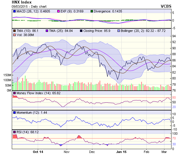 Chỉ báo kỹ thuật nghiêng về tích cực. MACD vẫn nằm trên đường tín hiệu và đường 0 để ủng hộ kịch bản tích cực trong ngắn hạn cho HNX.