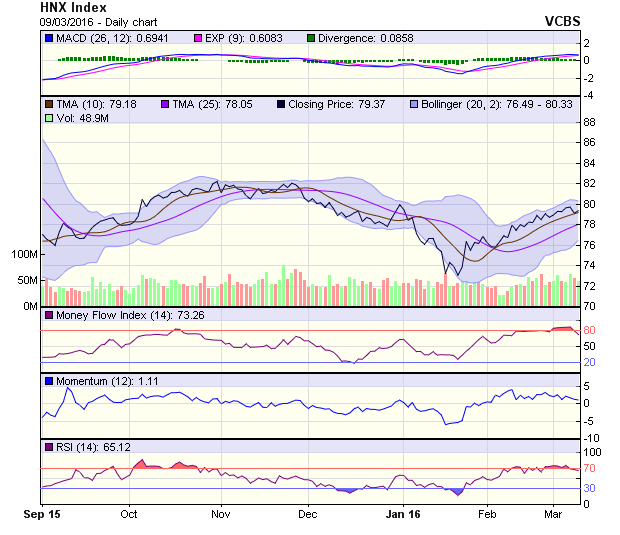 Trái ngược với diễn biến giảm điểm của VN-Index, chỉ số HNX-Index tăng điểm nhẹ và tiếp tục duy trì trên mốc 79 điểm. Hiện tại, lực cầu đỡ chỉ số ở mốc này khá tốt nên phiên điều chỉnh giảm sâu khó xảy ra, tuy nhiên chỉ số nhiều khả năng tiếp tục lình xình quanh mốc này khi chưa có dòng dẫn dắt rõ ràng. Vùng hỗ trợ cứng tiếp tục nằm ở 78-79 điểm.